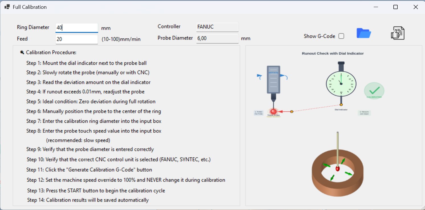 Perform full calibration without relying on machine macros. Step-by-step visual guide leads you through the process, system automatically generates G-Code. Mount the dial indicator, rotate the probe, press START - done. The era of complex macro programming is over.