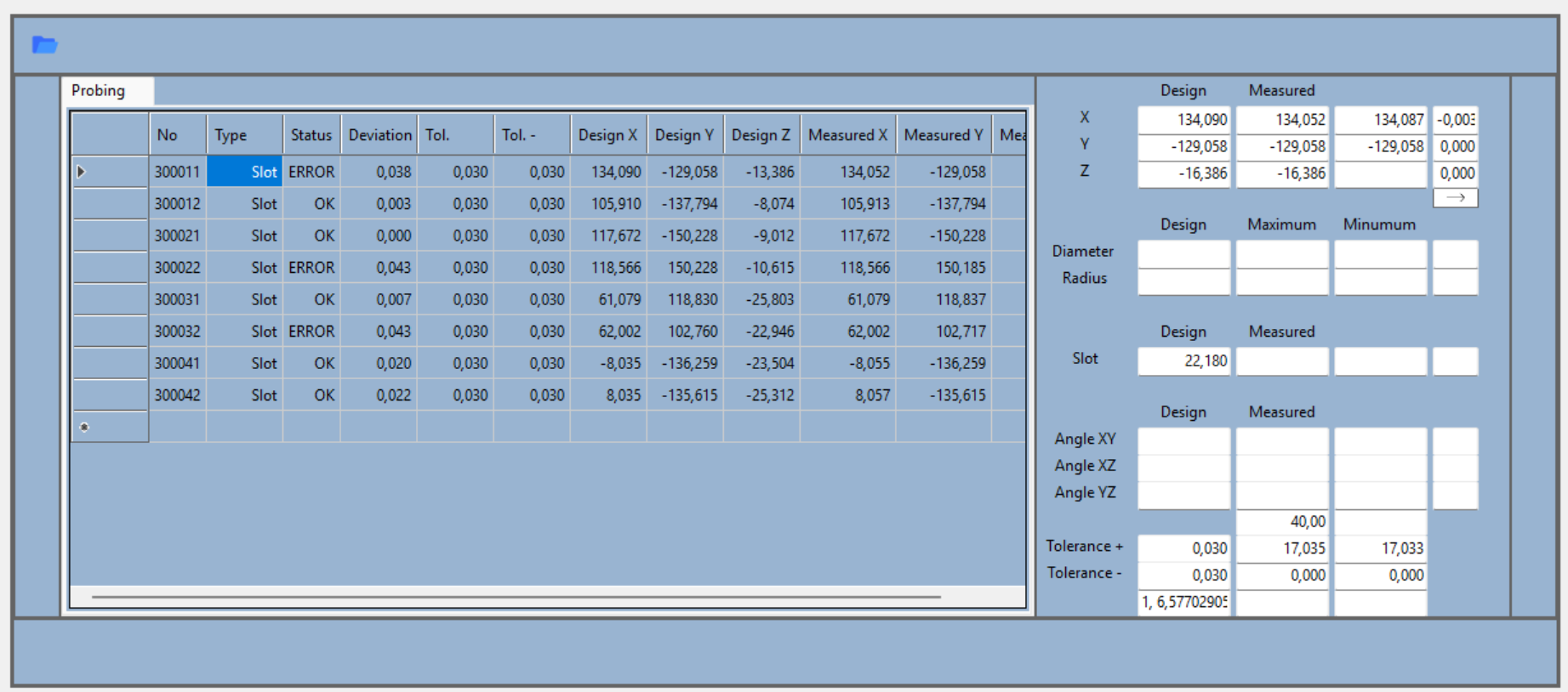 As soon as measurement completes, the system compares every point with the CAD model. Define your tolerance values, and the software automatically marks which measurements are OK and which are ERROR. Independent deviation analysis on X, Y, Z axes. Slot width, angle, diameter - all parameters under control. The era of manual calculation is over.